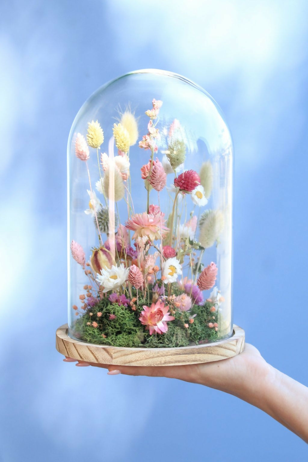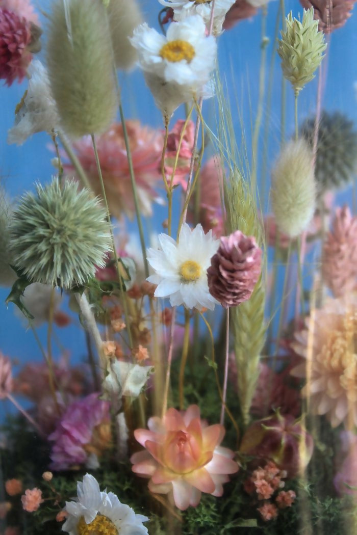 Este arreglo está creado 100% a mano dentro de un Fanal de Vidrio con una base de madera natural y un mix de flores secas y preservadas Holandesas en tonos rosados, blancos, neutros y toquea de azules.