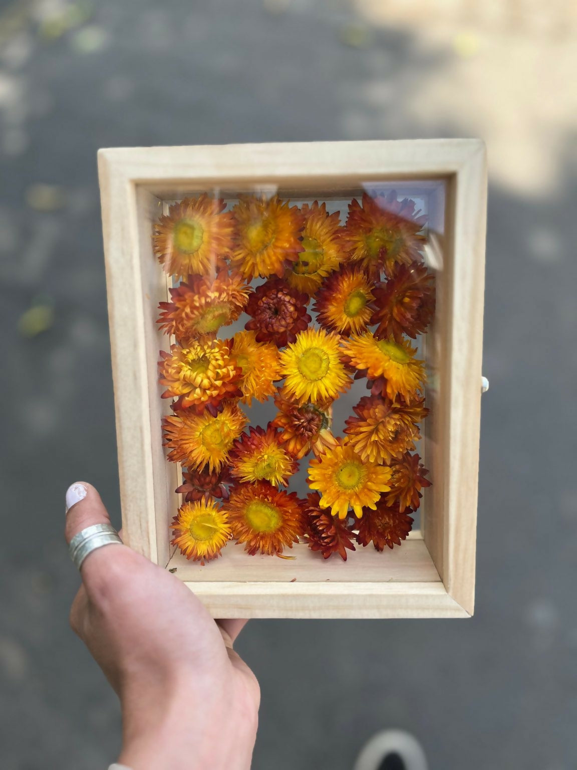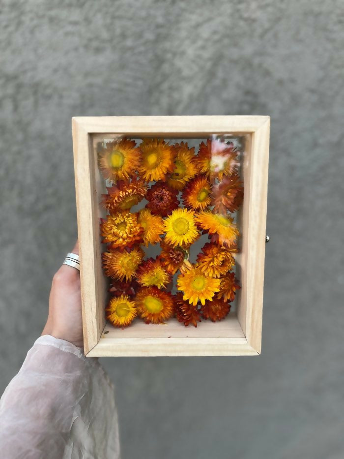 Incluye un marco de madera con Helicrisos Naranjos secos entre vidrios. Ideal para decorar un dormitorio, baño o cocina.