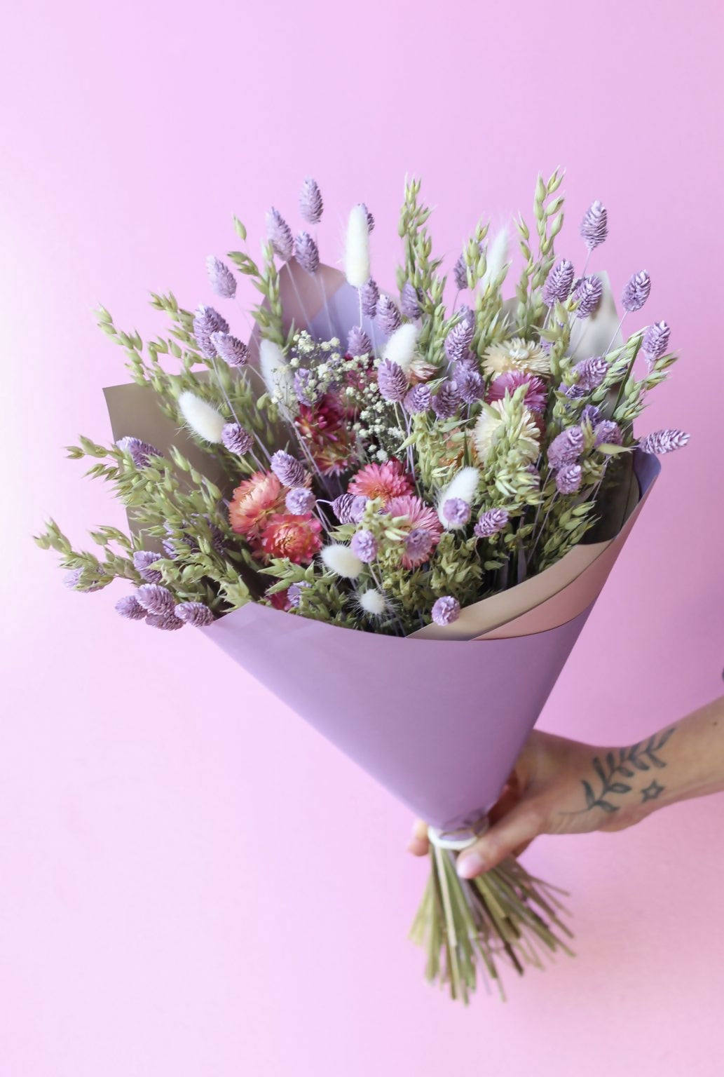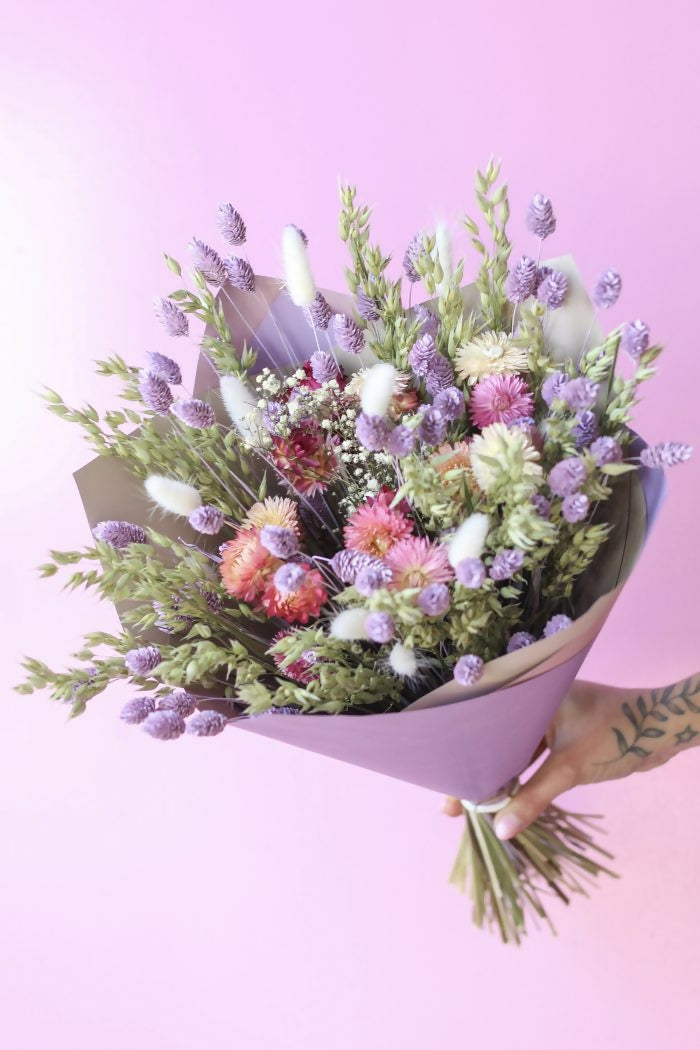 Este ramo es ideal para las personas dulces y alegres. Incluye un mix de flores secas holandesas en tonos rosados, lilas, blancos, neutros y verdes. Largo aproximado 40 cms.