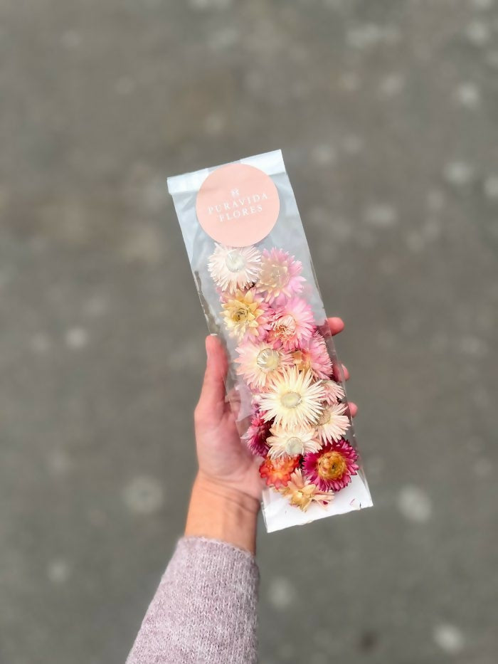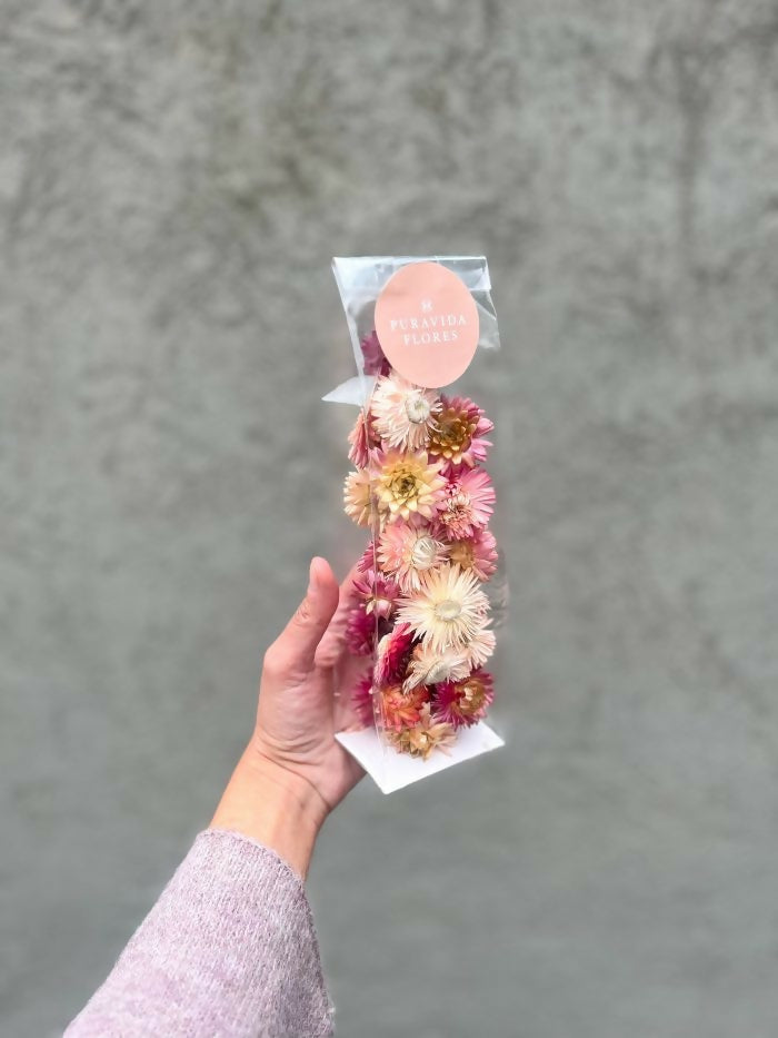 Incluye 10 grs de cabezas de Helicriso Rosado seco ideal para ser usado en manualidades, decoración, entre otros.