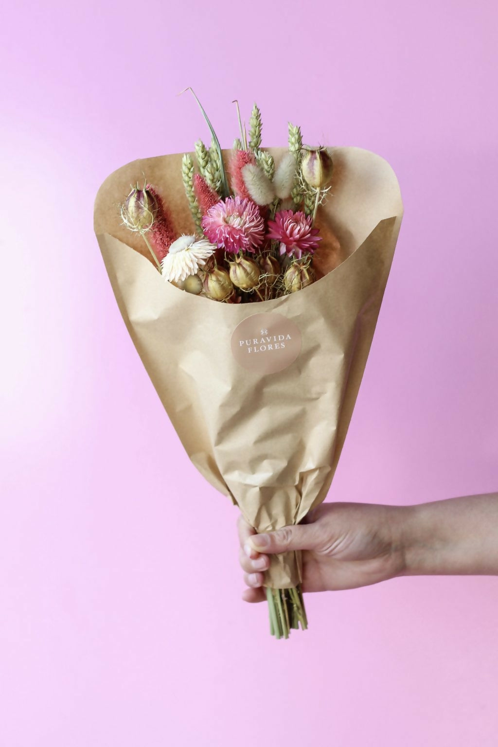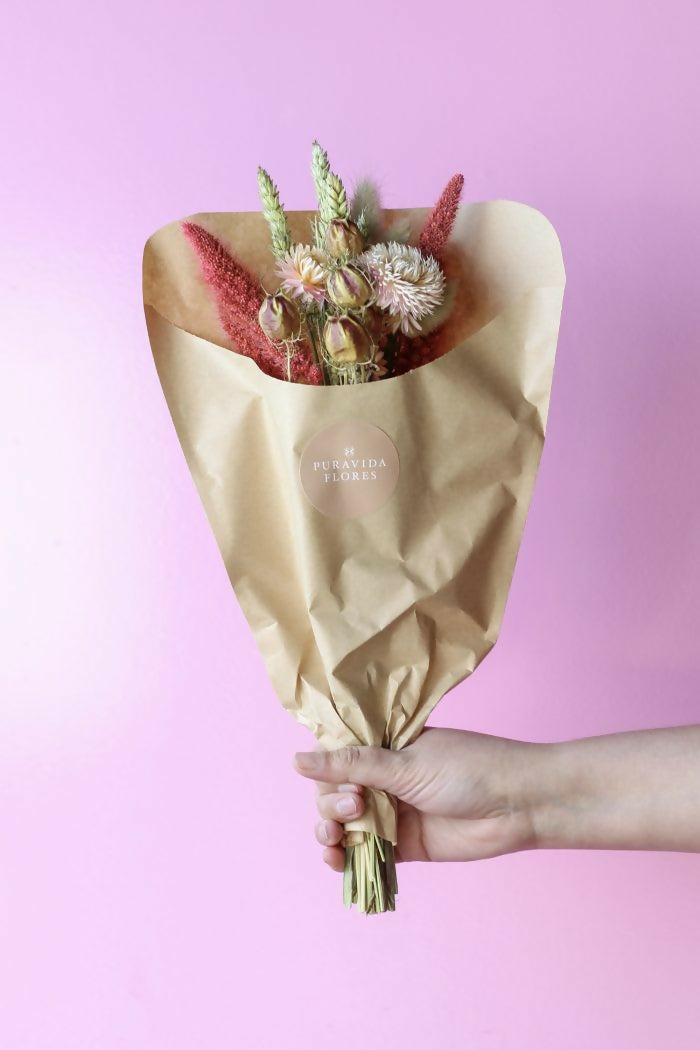 Este pequeño cucurucho de flores secas es ideal para aquellas personas románticas que le gusta el rosado y las texturas. Incluye un mix de flores secas holandesas en tonos rosados, fucsias, cafés, rojos y beige. Largo aproximado de 30 cms.
